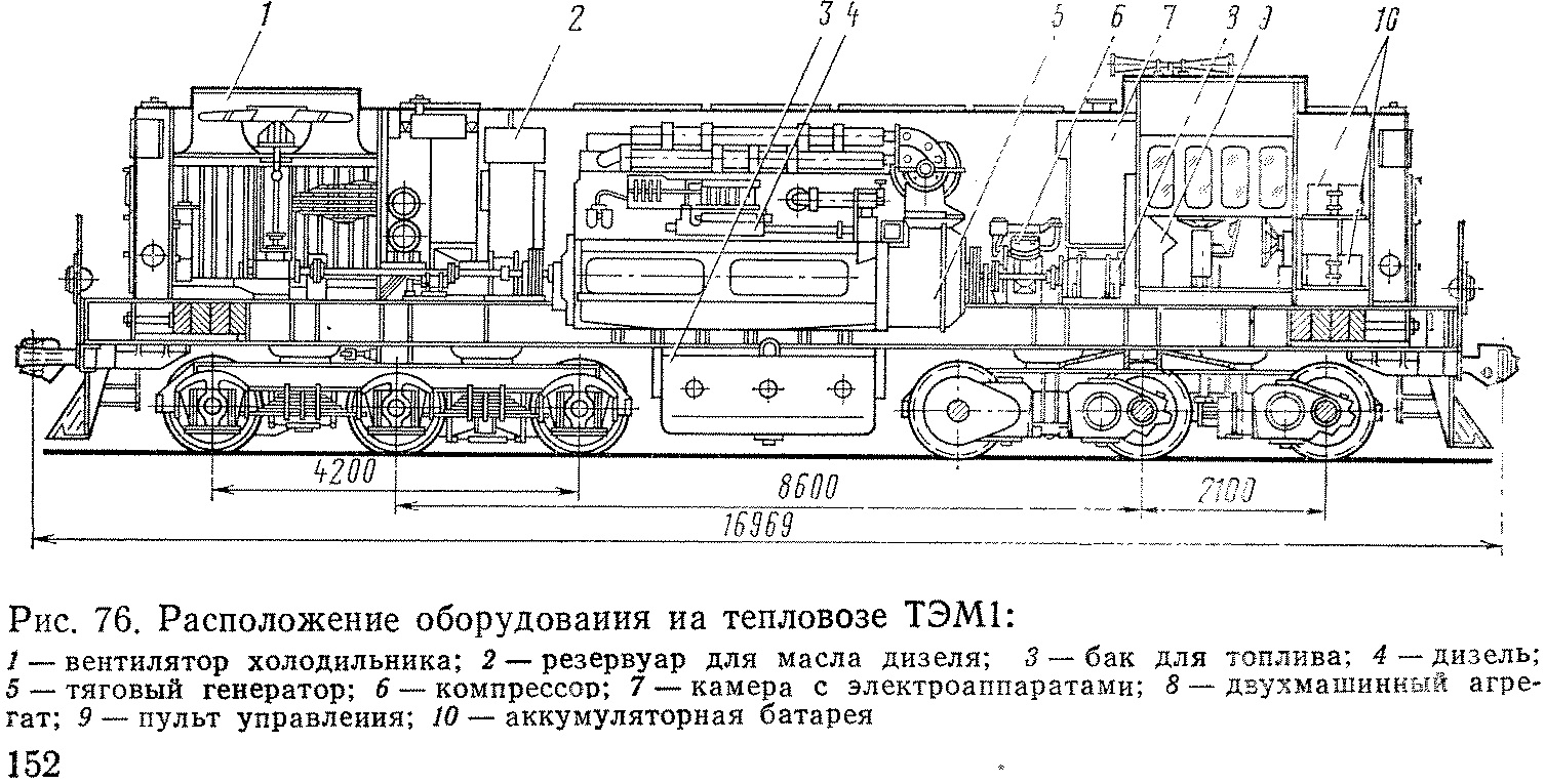 В 1966—1968 гг. Брянский машиностроительный завод выпускал шестиосные маневровые тепловозы ТЭМ1 (рис. 75 и 76), постройка которых началась в 1958 г. На тепловозах ТЭМ1 установлены дизели Пензенского дизельного завода и электрооборудование харьковского завода «Электротяжмаш».