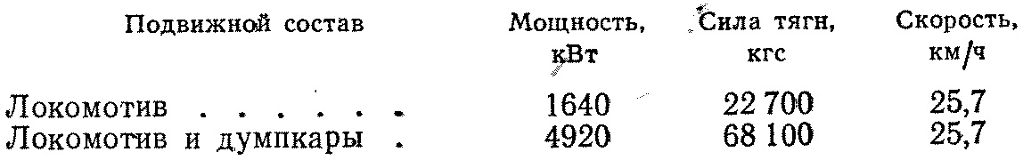 Общий вес электровоза с 2/з запаса песка, топлива, воды. и смазки 122,5 тс; вес моторного думпкара без груза 67 тс, т. е. общий сцепной вес тягового агрегата без груза 256,5 тс; грузоподъемность каждого моторного думпкара 55 т. При питании электровоза от контактного провода в часовом режиме тяговый агрегат имеет следующие данные: