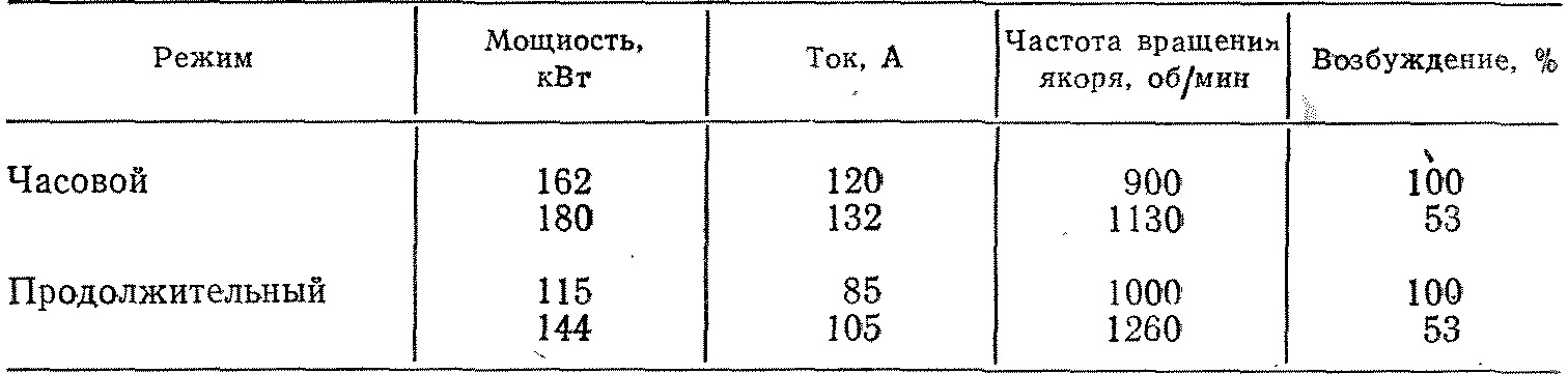 На моторных вагонах установлено по четыре тяговых электродвигателя ДК-ЮЗГ с опорно-осевой подвеской. Эти электродвигатели четырехполюсные, самовентилирующиеся с моторно-осевыми подшипниками,, имеющими постоянный уровень смазки. Главные полюсы расположены по вертикальной и горизонтальной оси, добавочные под углом 45° к ним. Обмотка якоря волновая, изоляция обмоток класса В, рассчитанная на номинальное напряжение 3000 В. Параметры электродвигателей при напряжении на выводах 1500 В приведены в табл. 15.