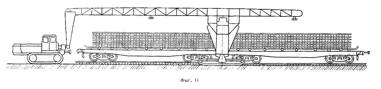 Путеукладчик ПБ-ЗМ (фиг. б) состоит из трактора Т-100М, снабженного комбинированным ходом, и прицепной части. Трактор с прицепной частью соединяется тягово-сцепным прибором, который механизмом сдвижки может смешаться в поперечном направлении-по отношению к оси пути на 400 мм, что облегчает укладку звеньев в кривых участках пути.