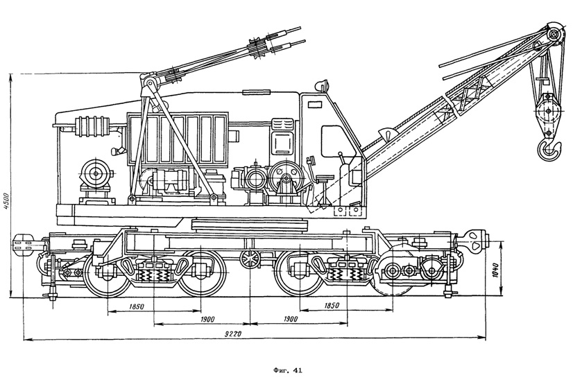 Дизель-электрический кран (фиг. 41) состоит из ходовой платформы, поворотной рамы, дизель-генераторной установки, рабочих механизмов, кузова, кабины управления, стрелы и грузозахватных устройств.