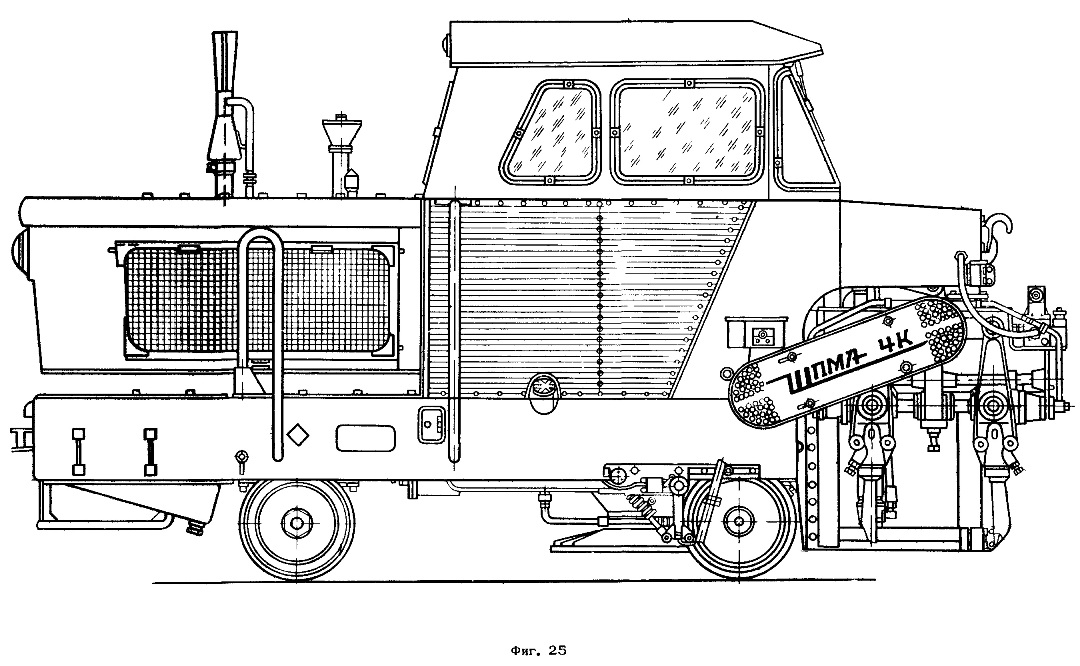 Шпалоподбивочная машина ШПМА-4К (фиг. 25) состоит из несущей рамы сварной конструкции; двигателя с муфтой сцепления; коробки привода с гидравлическими насосами; коробки перемены передач с рычагом управления; электромагнитной муфты; раздаточной коробки; стояночного тормоза с рычагом; двух подбивочных блоков с шестнадцатью подбойками; трансмиссии подбивочных блоков с карданными валами и клиноременными передачами; подвески подбивочных блоков с рычажной системой и гидроцилиндрами заглубления; подъемно-поворотного устройства; гидросистемы; электрооборудования; системы автоматики с приборами автоматического останова и пультов управления. Ходовой частью служат две колесные пары с гидравлическими тормозами, одна из них - приводная.