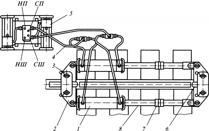 8 — удлинительные тяги; НП, НШ, СШ, СП — вентили (клапаны)