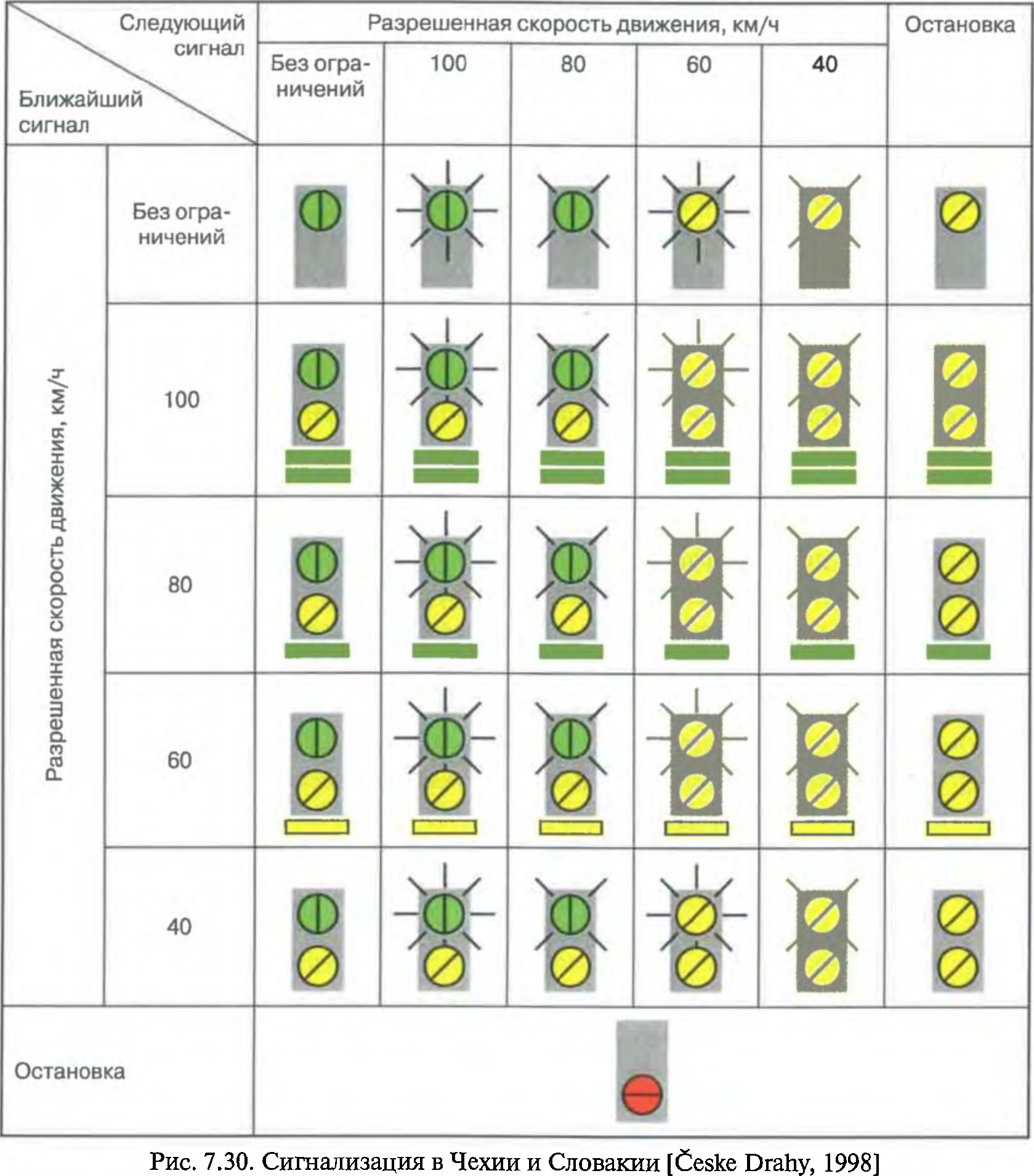 Благодаря применению погасшего показания в нижней части, означающего «Проследование», перегонные сигналы, не ограждающие стрелочные переводы, оборудуются только тремя лампами (зеленого, желтого и красного огней). Скоростные ступени Vj... v4 могут варьироваться и точно задаются в инструкциях по сигнализации каждой железной дороги. Не везде используются все четыре скоростные ступени, а их значения могут несколько различаться. Это позволяет адаптировать систему к принятым в разных странах маркам стрелочных крестовин. На рис. 7.30 изображены сигнальные показания в Чехии и Словакии, где применяют все четыре скоростные ступени.