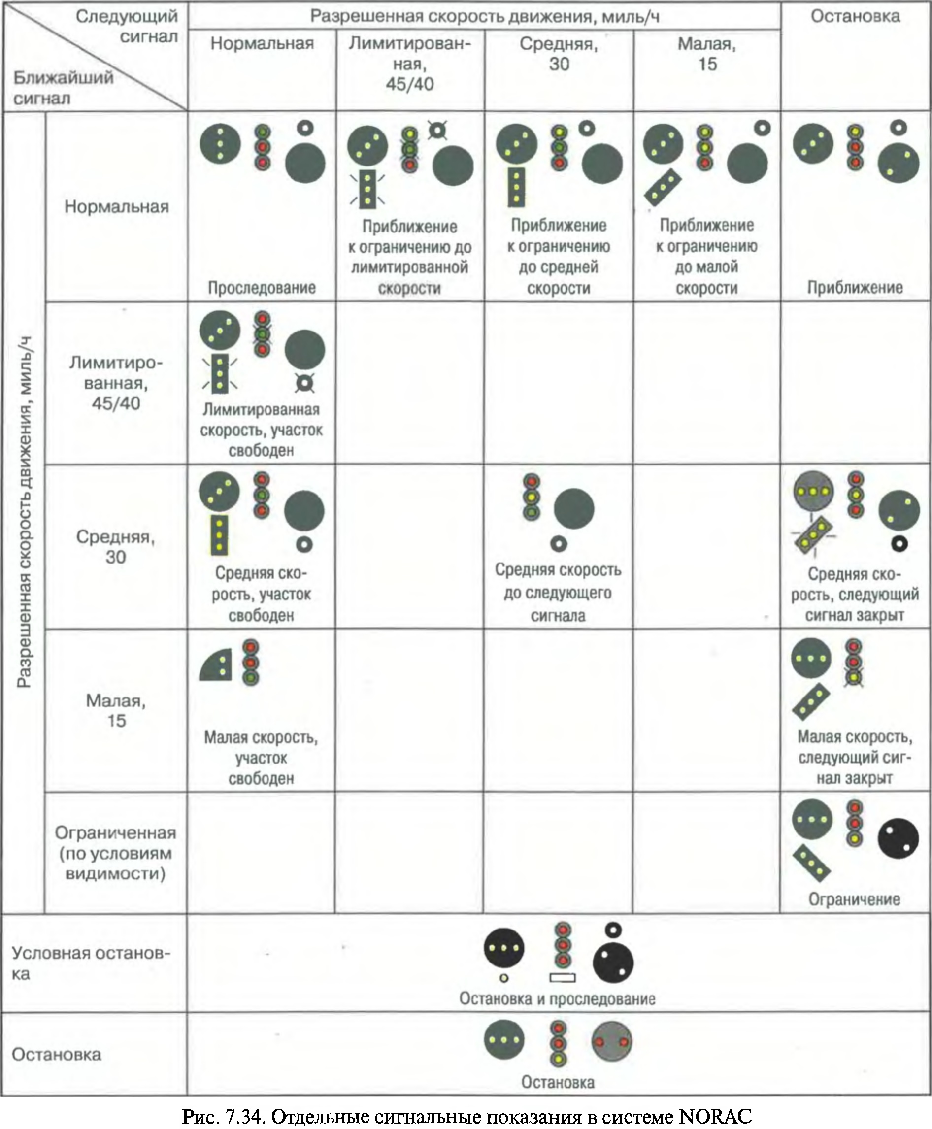 В правой части каждой ячейки на рис. 7.34 показаны сигналы, в которых разрешение на движение и скоростное ограничение разделены подобно тому, как это сделано в немецкой системе Ks (см. п. 7.5.6). Разрешение на движение (или сообщение о свободности участка, если разрешение по действующим правилам не передается особым образом) сигнализируется красными, желтыми или зелеными огнями и их расположением на круглом щите, тогда как скоростные ограничения (кроме ограниченной скорости) индицируются расположением и миганием или немиганием дополнительного белого или желтого огня.