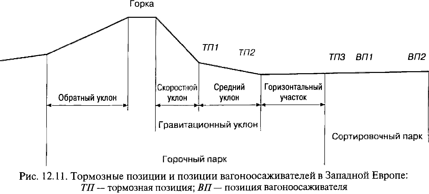 Сочетание замедлителей (и вагоноосаживателей) разных типов, а также варьирование расположением тормозных позиций и позиций вагоноосаживателей позволяют получить множество модификаций метода прицельного торможения. В Европе обычно замедлители располагаются таким образом, как показано на рис. 12.11. Замедлители называются по принципу действия (см. п. 12.3.2.1) или по функциональному назначению. Замедлители на тормозной позиции ТП1 обозначают как уклонные (ramp retarders —англ.). В основном на ТП1 предпочитают использовать двухрельсовые гидравлические балочные замедлители. Замедлители на 7772называют главными (hump retarders, main retarders—англ., в Великобритании их принято называть также king retarders, в Северной Америке — master retarders). Непосредственно прицельное торможение осуществляется в сортировочном парке (на ТПЗ). Устанавливаемые на ТПЗ замедлители называют вспомогательными (secondary retarders —англ., в Великобритании также —queen retarders, в Северной Америке — group retarders). На этой позиции предпочитают использовать однорельсовые гидравлические балочные или электродинамические замедлители либо упругие тормозные упоры. Также здесь возможно применение плунжерных замедлителей.