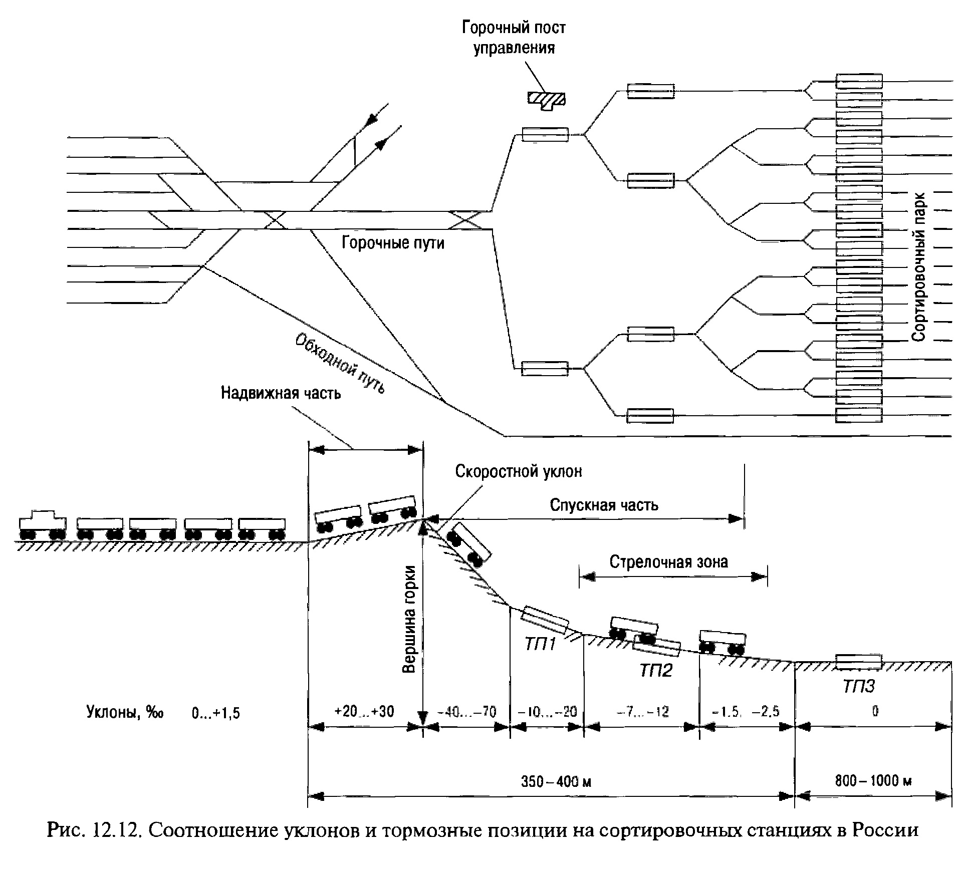 На рис. 12.12 показан пример, соответствующий действующим в России национальным требованиям по проектированию сортировочных горок. В рассматриваемом случае замедлители, расположенные на тормозной позиции ТП1, обеспечивают необходимые интервалы между скатывающимися отцепами в зоне между тормозными позициями ТП1 и ТП2. Замедлители, расположенные на тормозной позиции ТП2, предназначены для вытормаживания отцепов до скоростей, исключающих нагоны в зоне между тормозными позициями ТП2 и ТПЗ и дающих возможность перевода стрелок до подхода отцепа. Назначение замедлителей, расположенных на тормозной позиции 3, — снижение скорости движения отцепов, если это необходимо. Отцепы должны достигать требуемого местоположения на путях сортировочного парка, учитывая, что на этих путях уже находятся вагоны, т. е. с безопасной скоростью соударения. Такая скорость должна быть невысокой (например, в России она принята равной 5 км/ч).