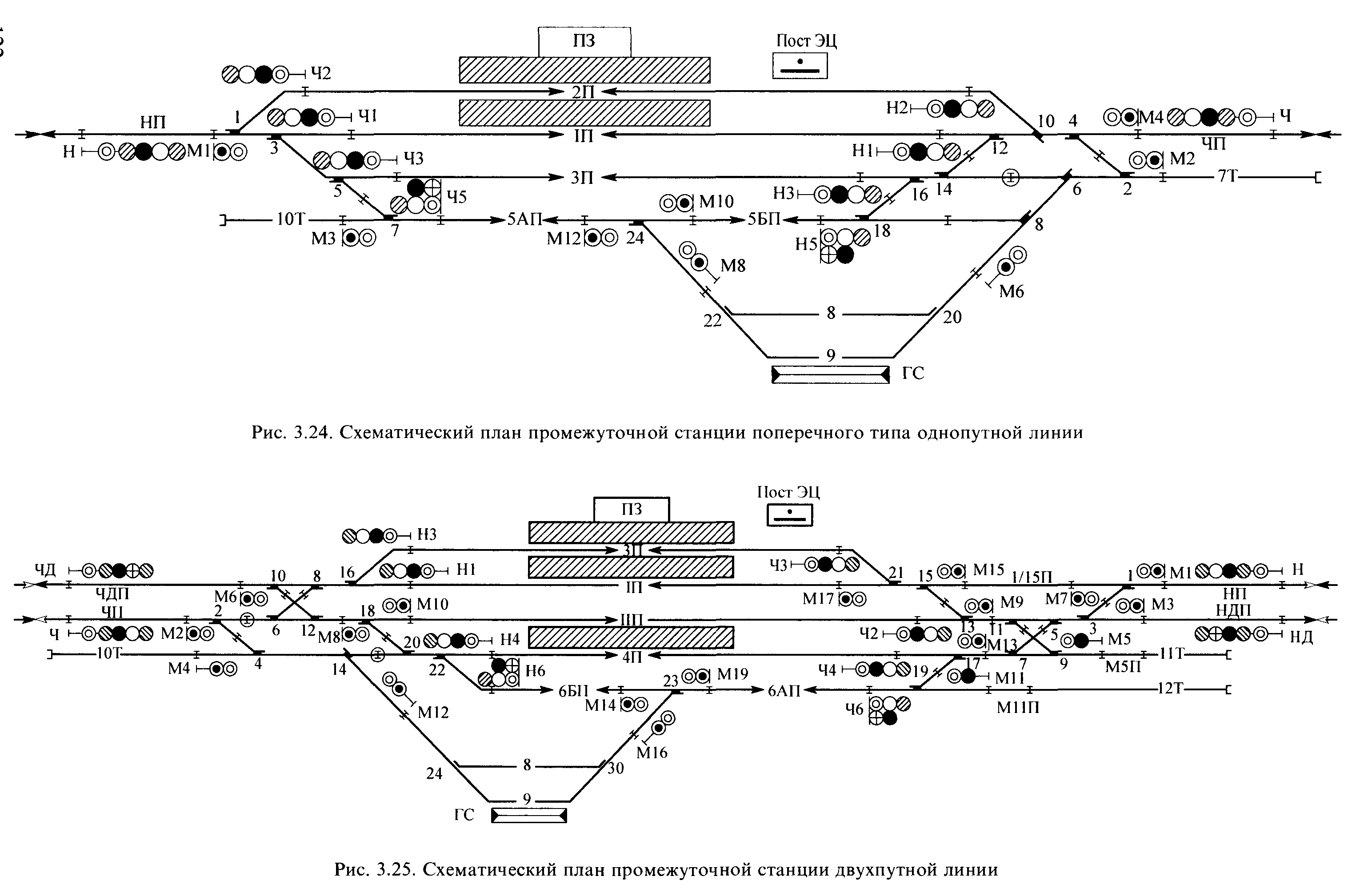 Основными техническими операциями на промежуточных станциях являются прием и отправление поездов, а при необходимости их пропуск без остановки. Пассажирские местные и пригородные поезда принимают на крайний перронный путь (рис. 3.24 путь 2П, рис. 3.25 путь ЗП) к пассажирскому зданию (ПЗ). Дальние пассажирские поезда, имеющие остановку на этой станции, останавливаются у платформ главных путей. Пассажирские и грузовые поезда, следующие по данной станции без остановки, пропускаются по главным путям Ш и ПП.