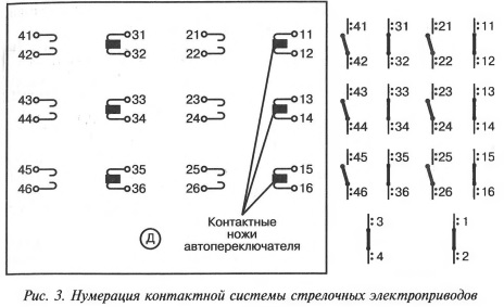 В конце перевода стрелки рабочие контакты 11-12, 13-14, 15-16 размыкаются, а контрольные контакты 21-22, 23-24, 25-26 замыкаются; тем самым дается контроль нового положения стрелки.
