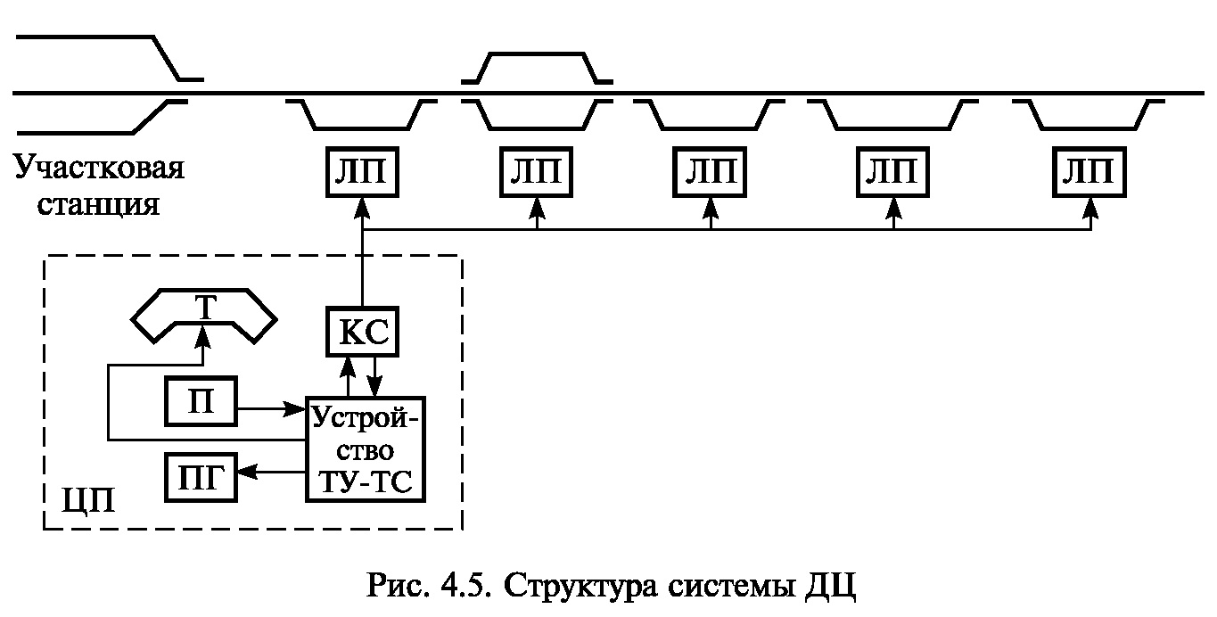 Общие сведенияАппаратура диспетчерской централизации предназначена для управления стрелками и сигналами целого диспетчерского участка практически на любом расстоянии и является, пожалуй, одной из самых прогрессивных систем автоматики и телемеханики. Впервые в России участок Люберцы — Куровская, протяженностью 65 км был оборудован устройствами диспетчерской централизации системы ДВК, разработанной институтом «Гипротранссигналсвязь». В 1956 году ЦНИИ МПС была разработана и внедрена система ПЧДЦ-56. Далее внедрялись системы ЧДЦ-66, ДЦ «Нева», ДЦ «Луч». Аппаратура ДЦ «Нева» и ДЦ «Луч» получила довольно широкое распространение на железных дорогах, аппаратура этих систем описана в справочнике. Целью данного раздела является ознакомление читателей с созданными системами ДЦ на микропроцессорной элементной базе и с ходом их внедрения на железных дорогах России. Следует отметить, что работы по созданию диспетчерской централизации на микропроцессорной элементной базе были начаты в 1982 году. Первая система диспетчерской централизации на микропроцессорной элементной базе АСДЦ была создана во ВНИИЖТЕ, НИИЖА и ГТСС. Она была выполнена на технических средствах КТС-ЛИУС и проходила испытания на участке Мельничный ручей — Ладожское озеро Октябрьской железной дороги. На таком же комплексе технических средств КТС-ЛИУС специалистами Ростовского университета путей сообщения была разработана система диспетчерской централизации «Дон» и внедрена в 1989-1994 гг. на ряде направлений. В 1995 году специалистами Петербургского университета путей сообщения была разработана и внедрена система диспетчерской централизации ДЦ-МПК на основе персональных ЭВМ (ПЭВМ) и промышленных контроллеров. В 1995 году эта система была принята в постоянную эксплуатацию на участке Петербург — Сестрорецк. На основе этой системы в 1997 году был создан центр диспетчерского управления в Санкт-Петербургском отделении Октябрьской железной дороги. В 1998—2001 гг. в постоянную эксплуатацию были приняты микропроцессорные системы диспетчерской централизации «Диалог», «Сетунь», «Тракт» и «Юг». К системам диспетчерского управления движением поездов, или, как их часто называют, кодовым системам централизации относятся диспетчерская централизация (ДЦ) и станционная кодовая централизация (СКЦ). В этих системах на посту управления и в линейных пунктах управления установлены избирательные устройства, преобразующие управляющие и известительные приказы в коды, посылаемые по общей линейной цепи — каналу связи. В приемной аппаратуре эти коды расшифровываются и воздействуют на управляемые объекты или элементы индикации. Диспетчерская централизация применяется для управления из центрального поста (ЦП) стрелками и светофорами промежуточных станций, называемых линейными пунктами (ЛП). С одного ЦП можно управлять линейными пунктами одного или нескольких диспетчерских участков. ДЦ позволяет поездному диспетчеру (ДНЦ) руководить движением поездов на участке и непосредственно управлять стрелками и светофорами на ЛП без участия дежурных по соответствующим станциям. В комплекс устройств ДЦ обязательно входят автоблокировка (или другие устройства, обеспечивающие контроль свободности перегона) на перегонах, ЭЦ на станциях и аппаратура телемеханики. Современные системы ДЦ облад