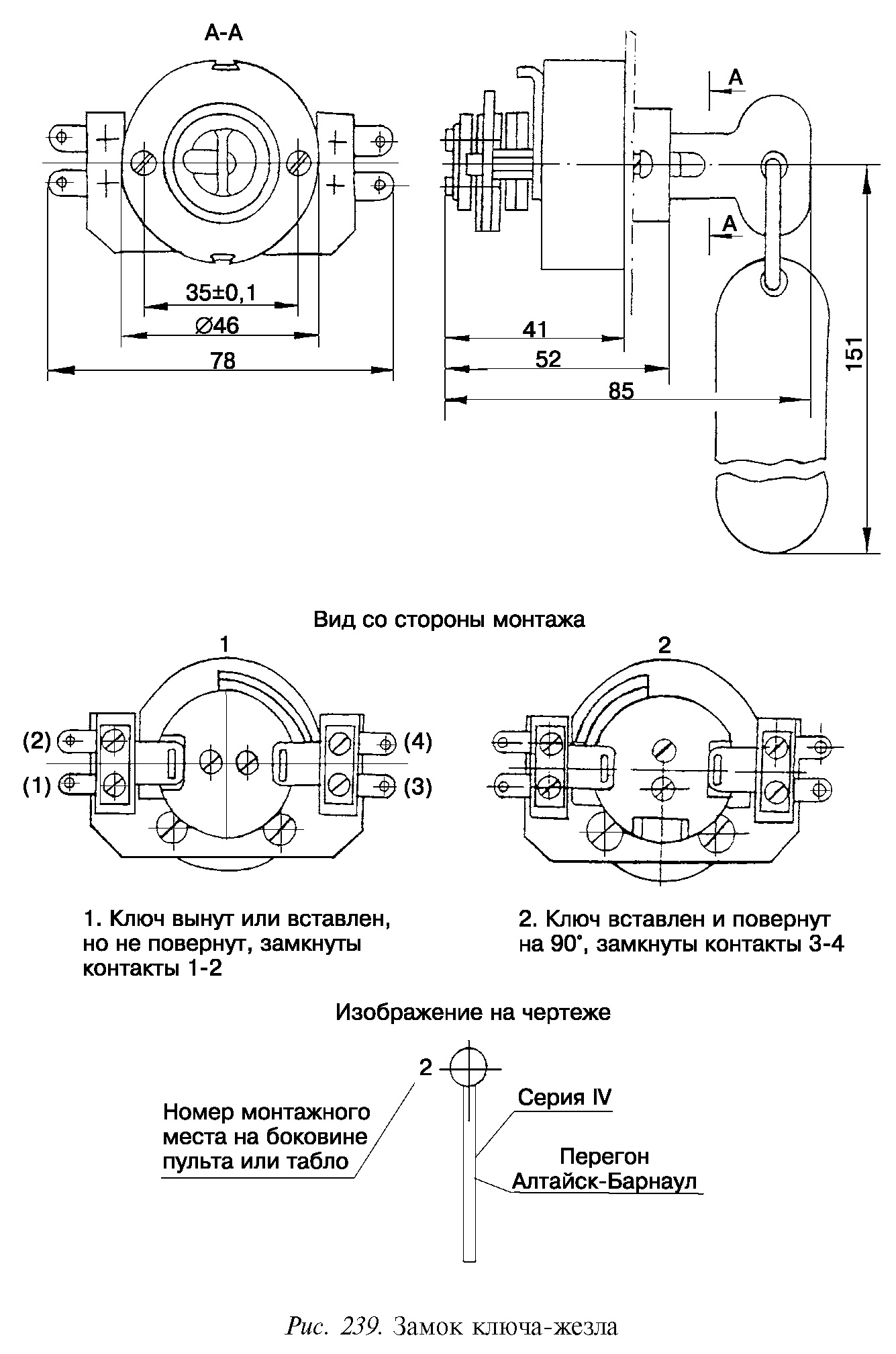 Замок ключа-жезла (черт. 13049-00-00) приведен на рис. 239. Серия ключа задается конкретным проектом. Замок ключа жезла имеет два положения: