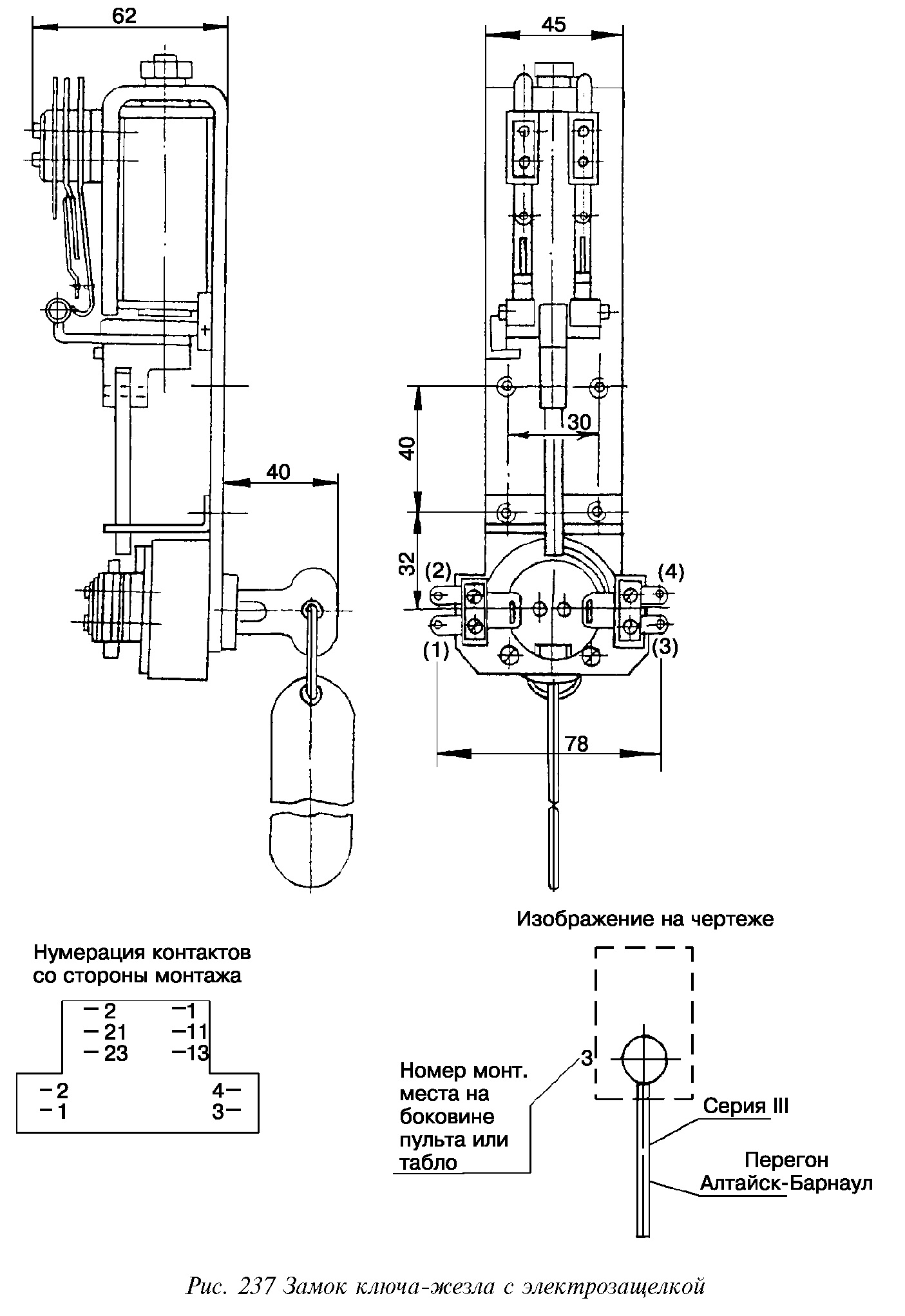 Замок ключа-жезла с электрозащелкой (черт. 380-00-00А) приведен на рис. 237. Серия ключа задается конкретным проектом. Замок ключа-жезла с электрозащелкой имеет два положения:
