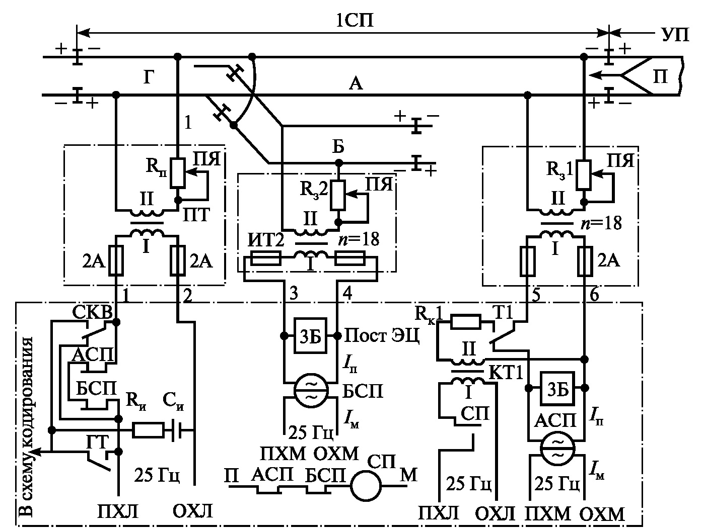 Рис. 1.21. РЦ частотой 25 1ц с реле типа ДСШ-13А и сигналами АЛС частотой 25 1ц