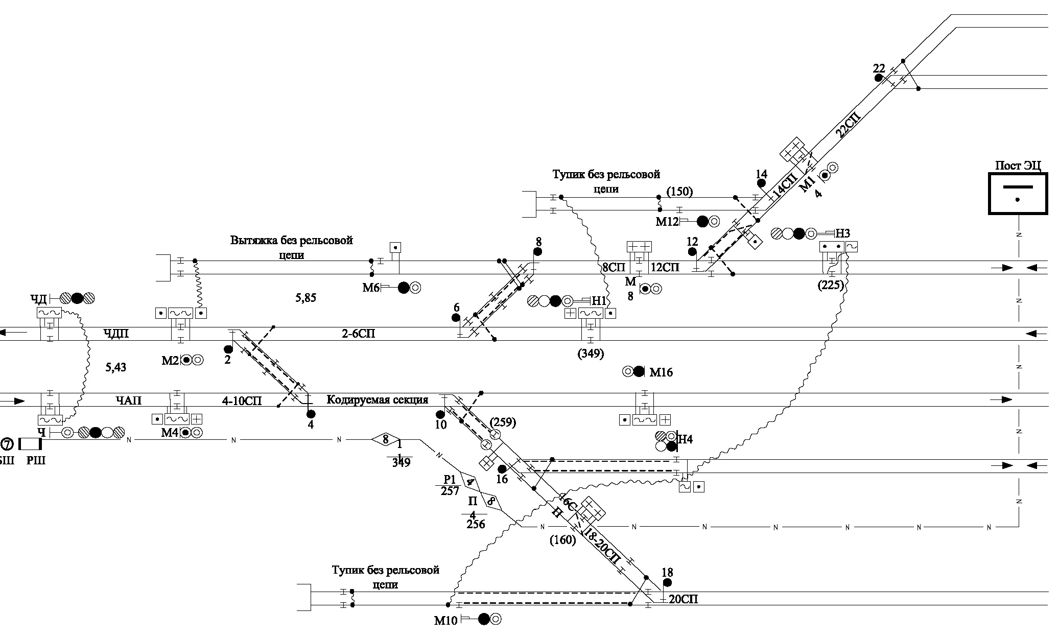 Двухниточный план станции - документ в составе проекта электрической централизации станции, отражающий информацию о рельсовых цепях на станции, план канализации тягового тока, размещение стрелочный приводов на стрелочных переводах и т.д.