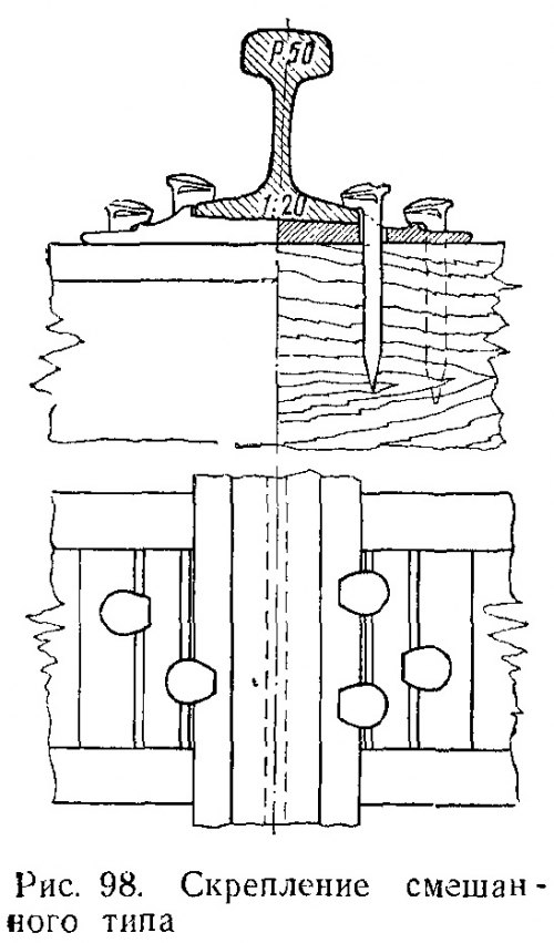 смешанные, при которых рельс прикрепляют к каждой шпале двумя или тремя основными костылями, проходящими через подкладку, и дополнительно забивают два жестких или распорных пришивочных костыля для прикрепления только подкладки к шпале;