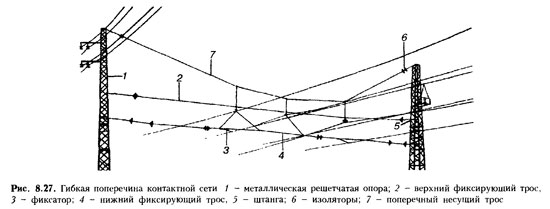Гибкая поперечина – поддерживающее устройство для подвешивания и фиксации проводов контактной сети, расположенных над несколькими путями. Гибкая поперечина представляет собой систему тросов, натянутых между опорами поперек электрифицированных путей (рис. 8.27). Поперечные несущие тросы воспринимают все вертикальные нагрузки от проводов цепных подвесок, самой поперечины и других проводов. Стрела провеса этих тросов должна быть не менее Vio длины пролета между опорами: это уменьшает влияние температуры на высоту крепления контактных подвесок. Для повышения надежности поперечин используют не менее двух поперечных несущих тросов.