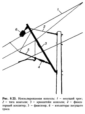 Консоль – поддерживающее устройство, закрепленное на опоре, состоящее из кронштейна и тяги. В зависимости от числа перекрываемых путей консоль может быть одно-, двух- и реже многопутной. Для исключения механической связи между контактными подвесками различных путей и повышения надежности чаще используют однопутные консоли. Применяют неизолированные, или заземленные консоли, при которых изоляторы находятся между несущим тросом и кронштейном, а также в стержне фиксатора, и изолированные консоли с изоляторами, размещенными в кронштейнах и тягах. Неизолированные консоли (рис. 8.25) по форме могут быть изогнутыми, наклонными и горизонтальными. Для опор, установленных с увеличенным габаритом, применяют консоли с подкосами. На сопряжениях анкерных участков при монтаже на одной опоре двух консолей используют специальную траверсу. Горизонтальные консоли применяют в тех случаях, когда высота опор достаточна для закрепления наклонной тяги. При изолированных консолях (рис. 8.26) возможно проводить работы на несущем тросе вблизи них без отключения напряжения. Отсутствие изоляторов на неизолированных консолях обеспечивает большую стабильность положения несущего троса при различных механических воздействиях, что благоприятно сказывается на процессе токосъема. Кронштейны и тяги консолей крепят на опорах с помощью пят, допускающих их поворот вдоль оси пути на 90° в обе стороны относительно нормального положения.