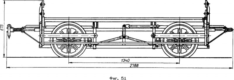 Транспортный прицеп ТП (фиг. 51) используется Для перевозки людей и грузов, имеет сплошной дощатый настил, подножки, два сцепных пружинных устройства и откидные борта с торцов. Оборудован ручным колодочным тормозом.