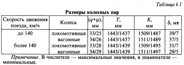 Если поставить колесную пару на прямом участке пути на рельсы так, чтобы гребень одного колеса был прижат к рельсу, то между гребнем второго колеса и рабочей гранью другого рельса будет зазор 8 (рис. 6.2). Так как существуют минимальные, нормальные и максимальные значения S, Г, и q, то соответственно существуют и зазоры Сигмаmin, Сигма0, Сигмаmax. Подставляя различные Г, q, ц, получим следующие значения 5 (табл. 6.1). Зазор 8 необходим для уменьшения сопротивления движению поездов и снижения износа рельсов и колес, для предотвращения заклинивания экипажей при движении и вкатывания гребня колеса на головку рельса. При слишком больших размерах Сигма ухудшаются условия взаимодействия пути и подвижного состава; увеличивается угол удара при набегании колес в прямых и при входе в кривые участки пути; ухудшается комфортабельность езды (при больших значениях Сигма больше качка и виляние экипажей); быстрее появляются расстройства пути; требуется больше затрат на его техническое обслуживание.