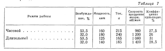 53,5% возбуждения соответствуют «нормальному» полю, 32,0% — «ослабленному». При «полном» (усиленном) поле возбуждение равно 92,5%, скорость вращения якоря при часовом токе на этом режиме — 700 об!мин. максимальная скорость вращения якоря — 2 080 об!мин, вес электродвигателя — 2 000 кг.
