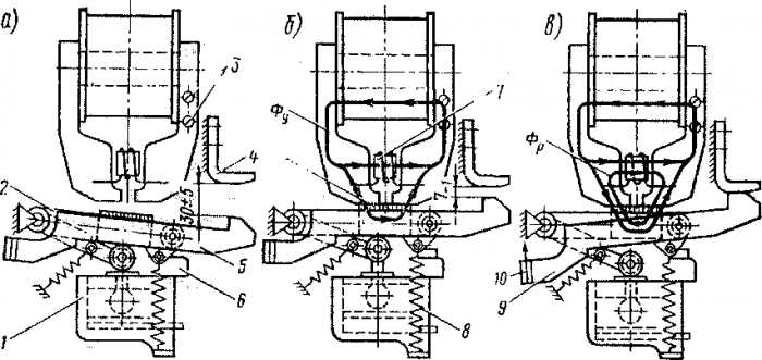 Чтобы включить БВ, необходимо подать питание на удерживающую катушку (рис. 54, а). После ее возбуждения подвижная система рычагов не перемещается, поскольку из-за большого воздушного зазора между якорем и полюсами электромагнита ее притягивающее усилие мало. Затем подается напряжение наэлектрогшевматический вентиль, и под диафрагму поступает сжатый воздух. Шток с роликом начинает подниматься, воздействует на рычаги, растягивает мощные отключающие пружины 8 (рис. 54, б) и подводит якорь к электромагниту. На рис. 55 видно, что магнитный поток удерживающей катушки значительно возрос (тонкая линия), так как он замыкается не через воздушный зазор, а через плотно прижатый якорь. Теперь подвижная система будет удерживаться электромагнитом.
