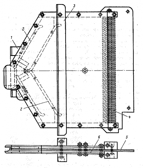 1 — контактный нож дугогасительного рога; 2 — дугогасительные рога; 3 — деревянный брус; 4 — деионная решетка; 5 — асбестоцементная перегородка: 6 — асбестоцементная стенка камеры