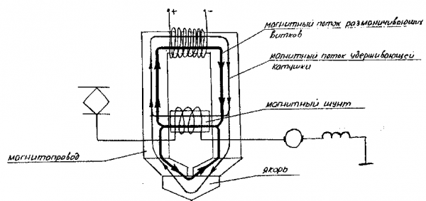 БВ выключается при размыкании цепи удерживающей катушки контактами соответствующих реле. Он также может быть выключен вручную. БВ срабатывает в случае превышения тока в силовой цепи величины уставки аппарата под действием размагничивающих витков (см. рис. 55), расположенных на магнитном мостике (шунте). Через этот дополнительный сердечник (или мостик) частично ответвляется магнитный поток удерживающей катушки.