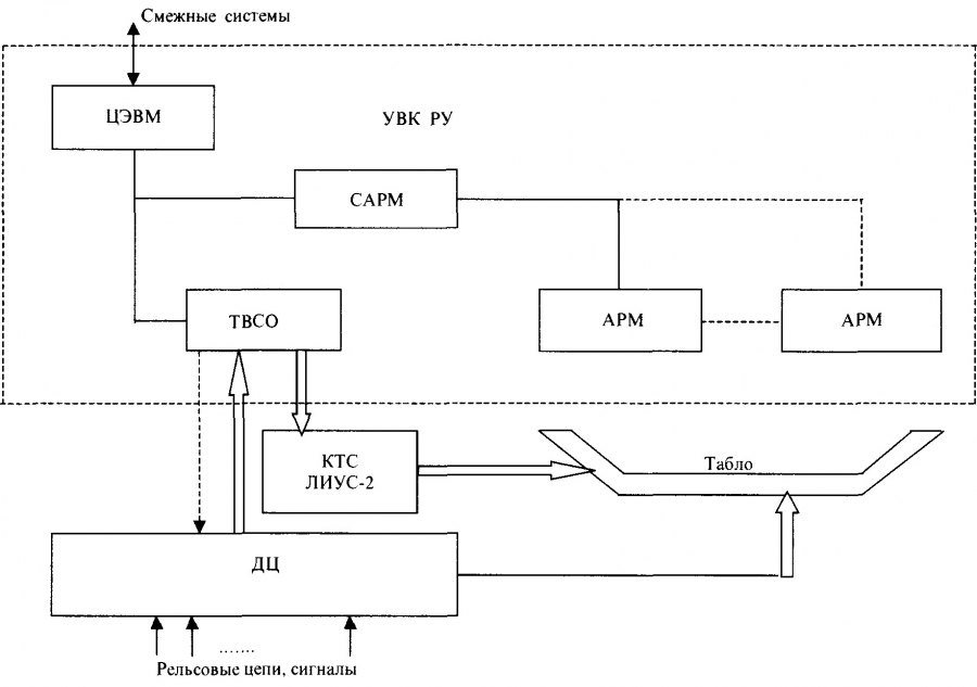 Ведущую роль в предоставлении диспетчерам визуальной информации играет табло-мнемосхема. Номера поездов в управляющий информационно-технический комплекс в полуавтоматическом режиме вводят смежные системы (технические средства других районов центра; АСОУП, взаимодействующая с АСУСС; операторы и диспетчеры).