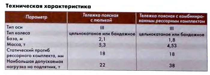 Поясные тележки благодоря простой конструкции получили широкое распространение в странах Европы и Америки под всеми четырехосными грузовыми вагонами. В России тележки начали строиться с 1898 г. Мытищинским вагоностроительным заводом Рессорный комплект вначале состоял из 4—6 двухрядных цилиндрических пружин, а позднее, для улучшения гашения колебаний, — из четырех двойных пружин и одной эллиптической рессоры.