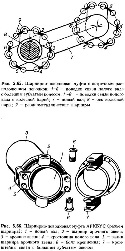В 90-е гг. распространение получили муфты с однонаправленным расположением 4-6 поводков (рис. 5.64) и муфты с встречным расположением шести поводков (рис. 5.65). Все муфты с однонаправленным расположением поводков обладают в той или иной мере кинематической погрешностью, т. е. при расцентровке валов передаточное отношение муфты не остается строго равным единице за один оборот муфты. Кинематической погрешности лишена только муфта с встречным расположением шести поводков. Вместе с тем ей присущ органический недостаток - она не допускает значительных осевых смещений соединяемых валов, т. к. в замкнутых кинематических цепях смежных поводков при этом возникают большие внутренние силы. Из запатентованных в последнее время муфт этой группы не имеет кинематической погрешности и допускает большие осевые смещения (до 20 мм) муфта АРКБУС (рис. 5.66). Муфты поперечной компенсации по кинематическим и динамическим качествам, как правило, уступают муфтам продольной компенсации, поэтому нашли применение только в тех случаях, где могут оказаться решающими их малые осевые размеры (например, в двусторонней передаче тепловоза ТЭП60 - муфта фирмы «Альстом»),