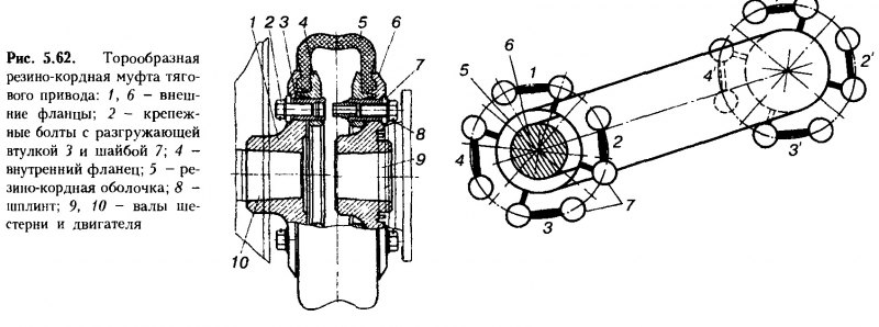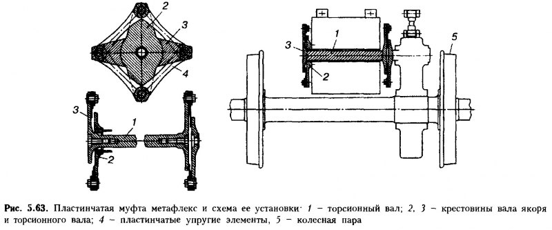 Среди тяговых муфт различают муфты поперечной и продольной компенсации (карданные муфты), в зависимости от того, в продольной или поперечной по отношению к соединяемым валам плоскостям поворачиваются промежуточные элементы муфты при паралдельной расцентровке валов. В приводах второго класса находят применение в основном муфты продольной компенсации: кулачковые муфты (на серийных вагонах отечественного метро), горообразные резино-кордные муфты (на пригородных электропоездах серий ЭР и ЭД, рис. 5.62), зубчатые муфты. Для снижения угловых деформаций шарнирных элементов увеличивают длину их промежуточных звеньев, для чего пропускают промежуточный торсионный вал внутри полого вала тягового двигателя. Примером могут служить пластинчатые муфты метафлекс (фирмы «Вулкан», Германия, рис. 5.63). В связи с применением высокоскоростных асинхронных тяговых двигателей расширяется применение зубчатых муфт, имеющих верхнюю границу рабочих частот вращения более 6000 об/мин. В приводах третьего класса наиболее распространенными на подвижном составе являются шарнирно-поводковые муфты продольной компенсации, конструктивно представляющие собой сочетание двух шарнирно-поводковых узлов с полым валом, охватывающим ось колесной пары.
