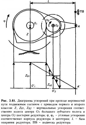 На диаграмме план тангенциальных ускорений зубчатых колес и корпуса редуктора (рис. 5.61) поясняет появление угловых ускорений и как следствие, динамических моментов на валу малого колеса (шестерни) приводов первого и второго классов при проходе колесом неровности пути. Из конструктивных соображений в приводах второго класса база опирания редуктора L как правило меньше, чем в приводах первого класса. Поэтому при прочих равных условиях динамические моменты в них могут быть соответственно больше. Для снижения динамических моментов в приводах второго класса применяют удлиненные кронштейны с увеличенной базой опирания L, горизонтальную реактивную тягу, упругий венец на большом зубчатом колесе, упругие тяговые муфты, упругую подвеску редуктора. В приводах первого класса с той же целью используют большое зубчатое колесо с упругим венцом. В приводах третьего класса, не имеющих жесткой кинематической связи с вертикальным перемещением колесной пары, угловые скорости и ускорения редуктора определяются только галопированием тележки, поэтому они малы и, как правило, специальных мер по снижению составляющих динамических моментов, вызванных проходом неровностей пути, не требуется.