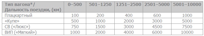 Баллы в программе начисляются в соответствии с таблицей набора баллов, в которой учитывается дальность поездки, а также тип вагона: «Плацкартный»; «Купе»; СВ («Люкс»); ВИП («Мягкий»).