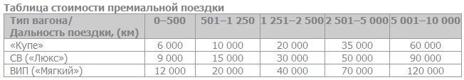 www.rzd-bonus.ru, пользу участника программы лояльности или другого лица (но не более 10 раз в год). Он может быть оформлен только на поезда/ вагоны формирования ОАО «ФПК», курсирующих по территории РФ и за ее пределами, в категориях вагонов «Купе», СВ («Люкс»), ВИП («Мягкий»), за исключением категорий «Общий», «Сидячий» и «Плацкартный». При оформлении премиального билета участник оплачивает страховой сбор, стоимость постельного белья и 1% от применяемого тарифа.