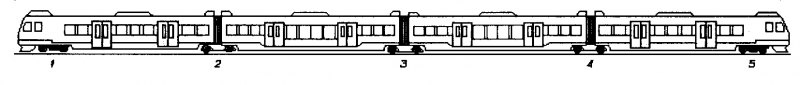 1,5 - традиционные двухосные моторные тележки; 2,3,4 - сочлененные одноосные тележки FEBA.