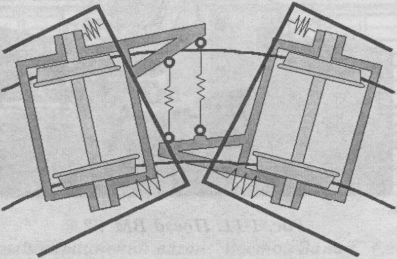Сочленение одноосных тележек выполняется с помощью двух параллельных, расположенных в горизонтальной плоскости поперечных направляющих (рис. 1-14). При этом тележки FEBA могут взаимно перемещаться в продольном и вертикальном направлениях и, кроме того, поворачиваться вокруг продольной оси. Тем самым обеспечивается большая, чем в обычных тележках, мягкость при повороте. При прохождении кривых не возникает большой разницы в нагружении осей, благодаря чему обеспечивается высокая безопасность в отношении схода с рельсов.