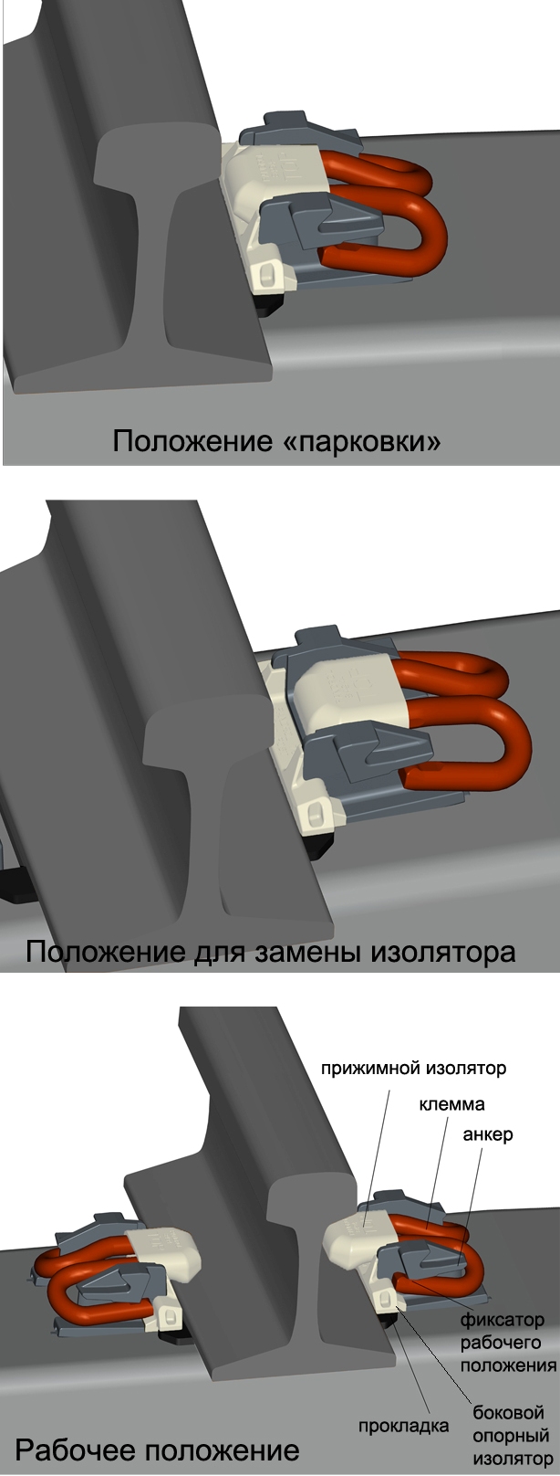 Анкер электрически изолирован от рельса боковым опорным изолятором. Клемма электрически изолирована от рельса изолятором прижимной части.