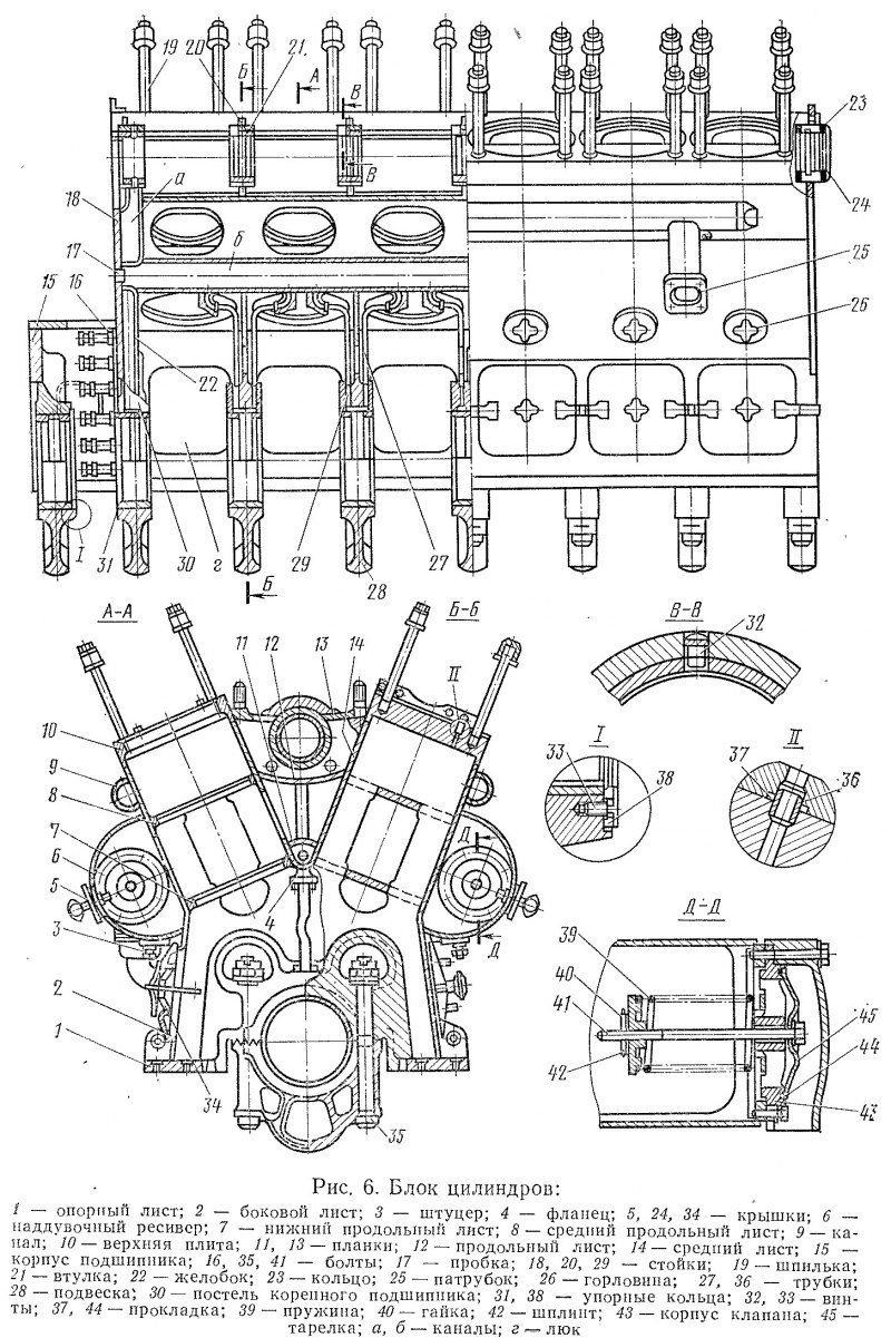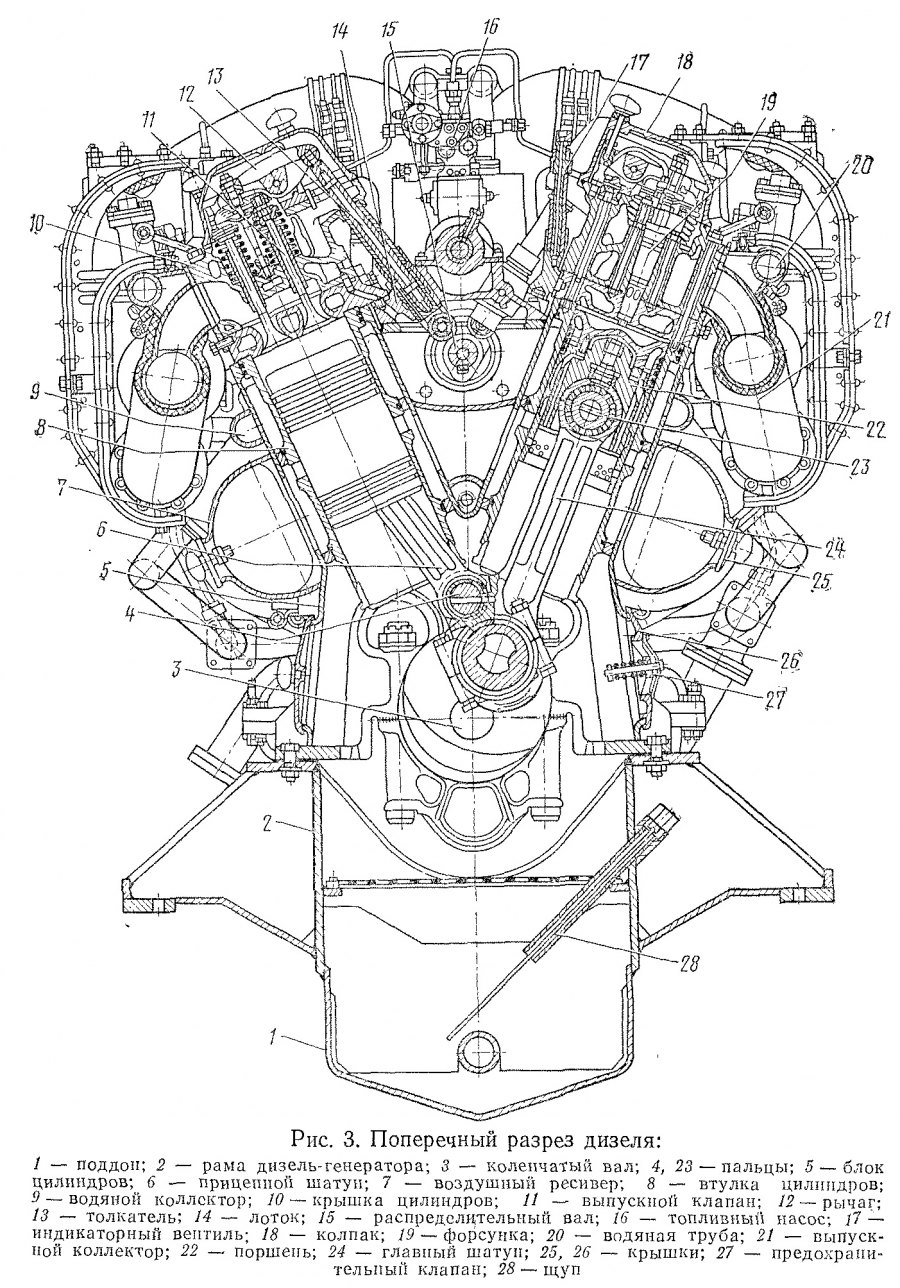Дизель 14Д40 (рис. 3) представляет собой двухтактный двенадцатицилиндровый двигатель простого действия с прямоточной клапанно-щелевой продувкой, с двухрядным V-образным расположением цилиндров и комбинированной двухступенчатой системой наддува. Блок цилиндров 5 установлен на раме дизель-генератора 2 и закреплен болтами. Рама имеет поддон 1, служащий резервуаром- для масла. Уровень масла замеряют масломерным щупом 28, расположенным с правой стороны дизеля. В нижней части к блоку цилиндров на стальных подвесках подвешен коленчатый вал 3. В блоке дизеля в два ряда установлены двенадцать (по шесть в ряд) цилиндровых втулок 8. Втулки подвешены и прикреплены шпильками к крышкам цилиндров 10, которые в свою очередь крепятся к блоку цилиндров. В крышках размещены форсунки 19, выпускные клапаны 11, а также установлены индикаторные вентили 17 и стойки с рычагами 12 привода выпускных клапанов. Крышки сверху закрыты колпаками 18.