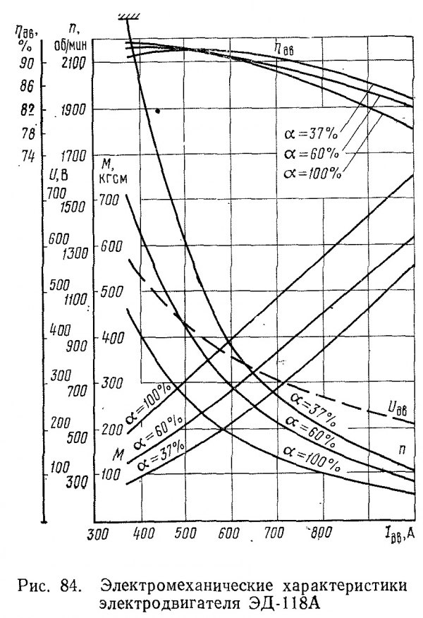 Электромеханические характеристики электродвигателя ЭД-118А приведены на рис. 84. В отличие от обычных электрических машин постоянного тока электродвигатель ЭД-118А имеет конструктивные особенности, связанные со специфическими условиями работы и установкой его на тепловозе (моторно-осевые подшипники, восьмигранная форма магнитопровода, повышенное удельное давление щеток на коллекторе).