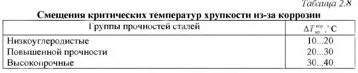Как известно, переход от механизма вязкого разрушения стали к квазихрупкому определяется, наряду с другими факторами, значением критической температуры Tкр1 которая зависит от конструктивной формы [29] и соответствует 50 % составляющей вязкого излома в сечении. Коррозионный износ понижает температуру Ткр1. Величина этого смещения показана в табл. 2.8.