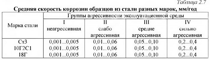 В зависимости от интенсивности коррозионного износа металлоконструкций в соответствии с нормами [42] атмосферная среда по агрессивности делится на четыре группы: неагрессивную, слабоагрессивную, среднеагрессивную и сильноагрессивную, в которых стали разных марок имеют одинаковые скорости коррозии по группам (табл. 2.7).