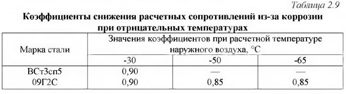 Более интенсивное падение прочностных характеристик из-за коррозии имеет место при отрицательных температурах. Понижающие коэффициенты могут быть приняты по табл. 2.9.