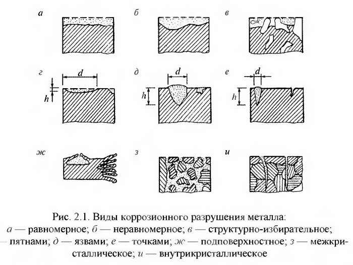 При локальной коррозии разрушение сосредоточивается на отдельных участках поверхности, и в зависимости от размера поражений различают коррозию пятнами (d > h), язвенную (d = h) и питтинговую, или точечную (d < h). Язвенная и питтинговая коррозия листового металла при сквозном его разрушении превращается в сквозную коррозию. Из питтинговой коррозии со временем может развиться подповерхностная коррозия, захватывающая слой металла под очень тонким (например, наклепанным) слоем, который впоследствии вздувается и растрескивается, (рис. 2.1, г, д, е, ж).