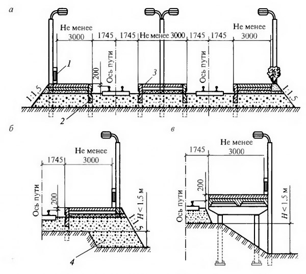 Рис. 1.11. Низкие пассажирские платформы: а — боковые и промежуточная; б — расположена на насыпи высотой до 1,5 м; в — на насыпи более 1,5 м; У — бортовая железобетонная стенка; 2 — стойка; 3 — плита; 4 — засыпка
