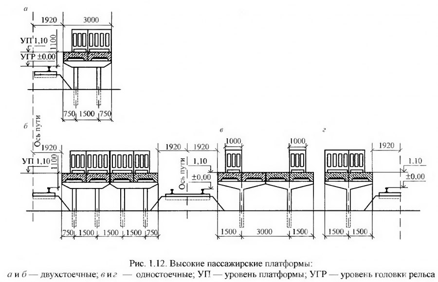 Платформы бывают высокие и низкие (1100 или 200 мм от верха головки рельса соответственно). Высокие платформы сооружают на пассажирских