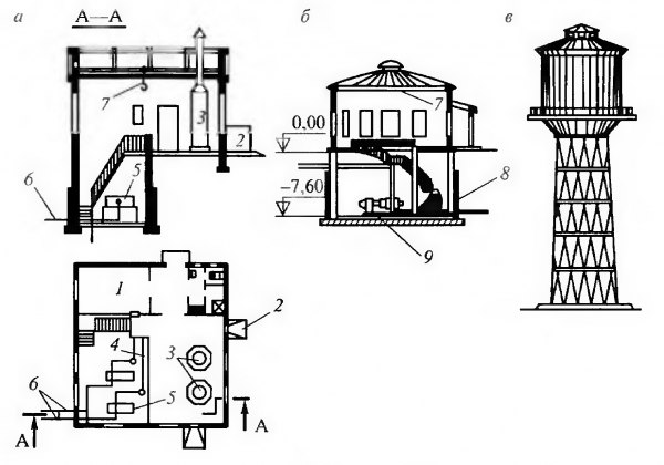 Рис. 1.13. Здания и сооружения водоснабжения: а — полузаглубленная насосная станция; б — заглубленная насосная станция; в водонапорная Оашня, 1 хлоратирная, 2 бункер для угля; 3 паровой котел; 4 — нагнетательная линия; 5 — паровой насос; 6 — всасывающая линия; 7 — кран-балка; 8 — защитная стенка; 9 — электронасос