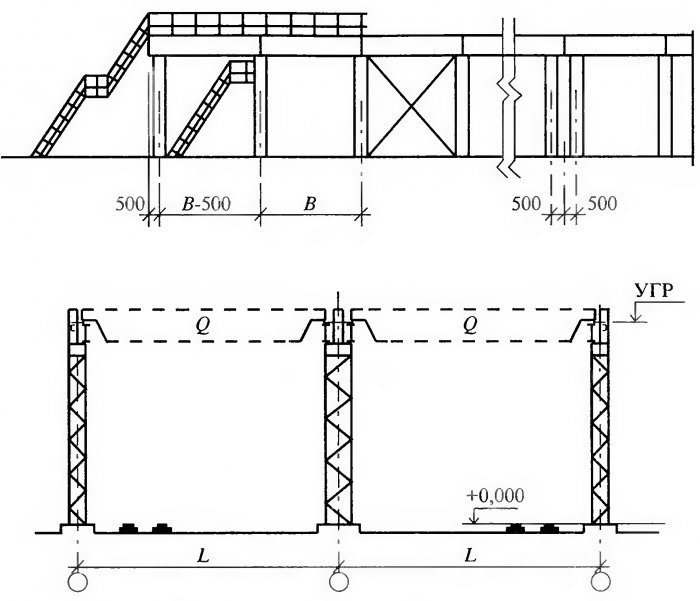 Открытая крановая эстакада представляет собой инженерное сооружение, состоящее из колонн и горизонтального пролетного строения с установленными на них мостовыми кранами. Такие эстакады используют для механизации погрузочно-разгрузочных работ на складах промышленных предприятий железных дорог для материалов и изделий, хранение которых допускается на открытом воздухе (рис. 1.15). Габаритная схема эстакады определяется технологическим процессом и характеристиками мостового крана — грузоподъемностью, пролетом, режимом работы, высотой подъема груза и др.