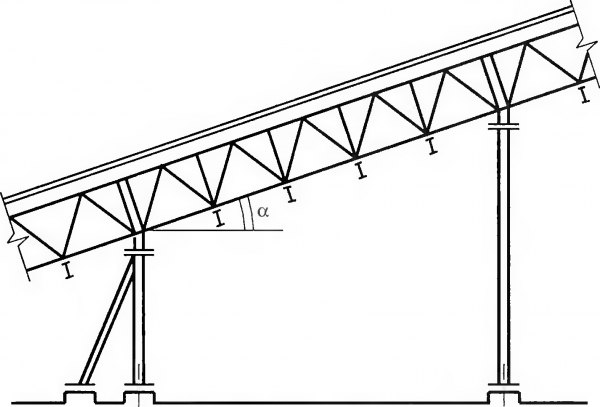 Транспортерные галереи предназначены для размещения конвейеров, с помощью которых производится перемещение сыпучих материалов Галереи представляют собой горизонтальные или наклонные сооружения с продольным углом наклона а, не превышающим 24 градуса (рис. 1.14). В зависимости от условий эксплуатации и требуемого температурного режима галереи устраивают отапливаемыми или неотапливаемыми.