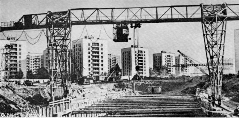 Ведется строительство подземного вестибюля и оборотного тупика станции. Вид в сторону перекрестка ул. Танкиста Хрустицкого и пр. Ветеранов, 1976 год