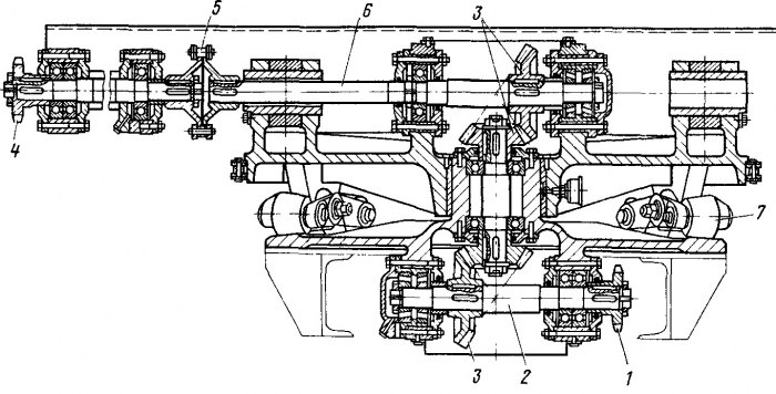 1—звездочка горизонтального вала; 2, 6—горизонтальные валы; 3—конические шестерни; 4—ведущая звездочка привода конвейера; 5—муфта; 7—каток